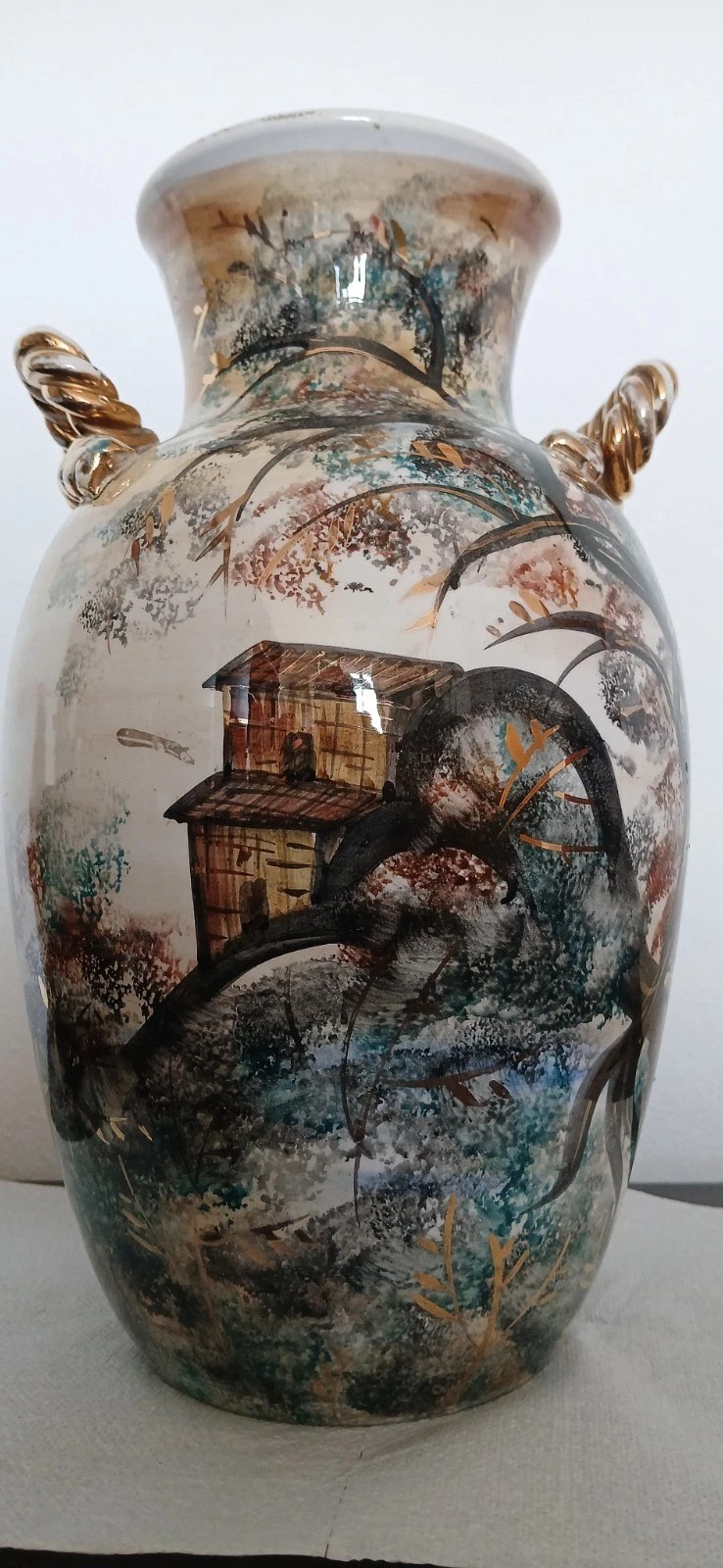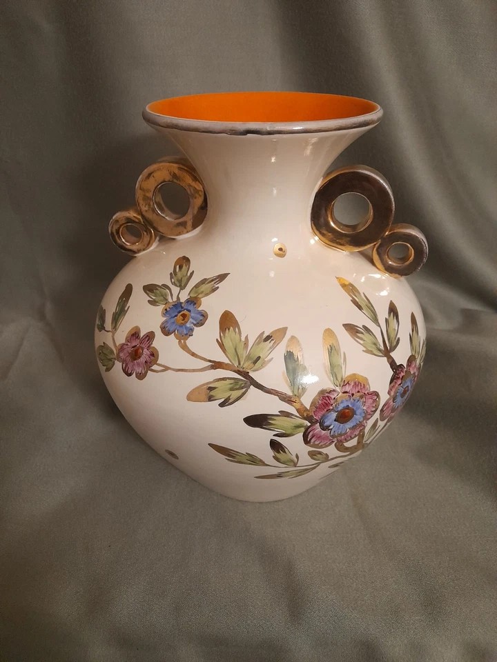 Vaso in ceramica a smalto rosso con decoro floreale, manici e bocca in oro, anni `50 (collezione privata)